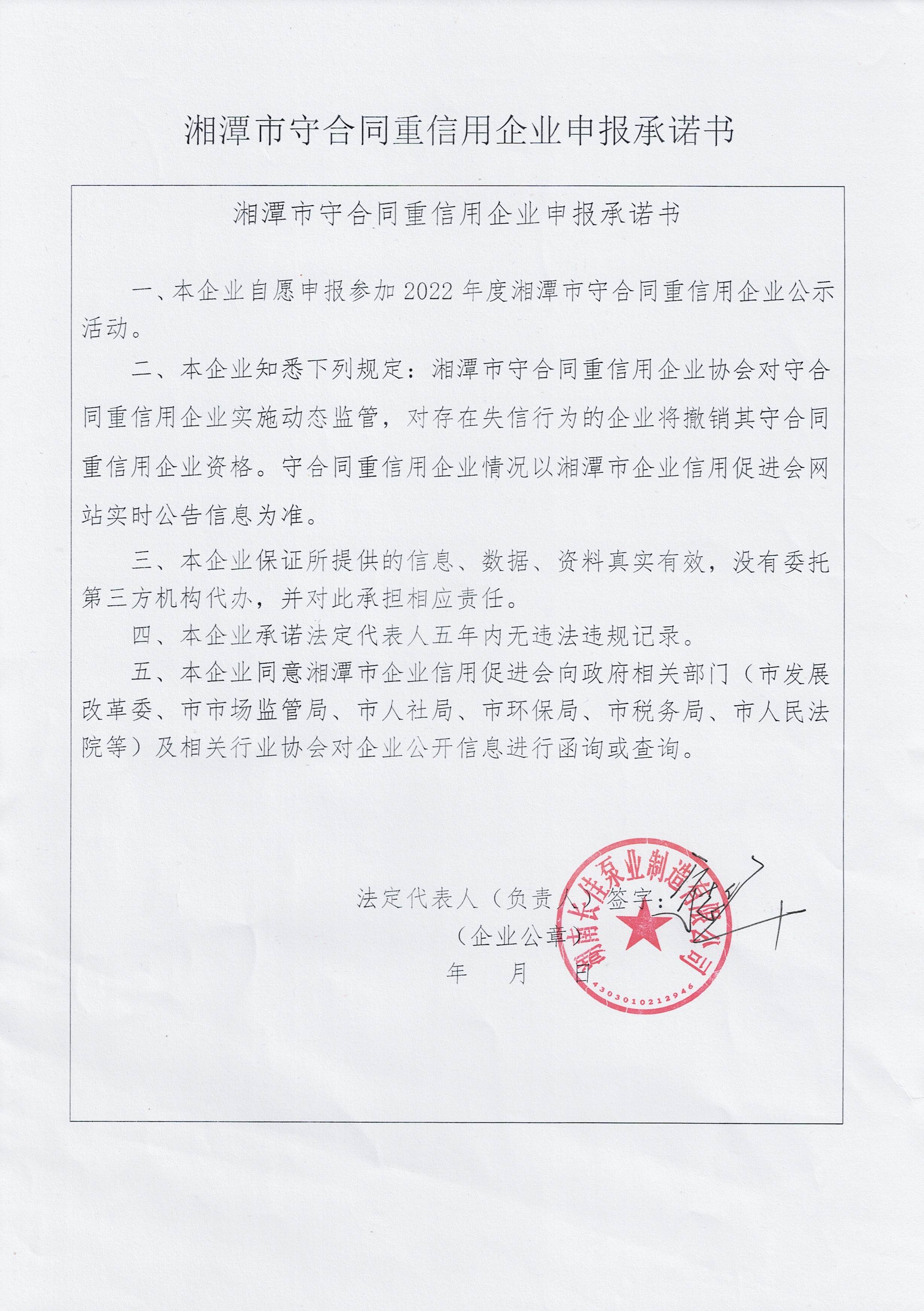 本企業(yè)根據(jù)《湘潭市守合同重信用企業(yè)申報規(guī)定》等編制 2022 年度企業(yè)信用報告書,并保證本報告書內(nèi)容真實(shí)、準(zhǔn)確、完整。