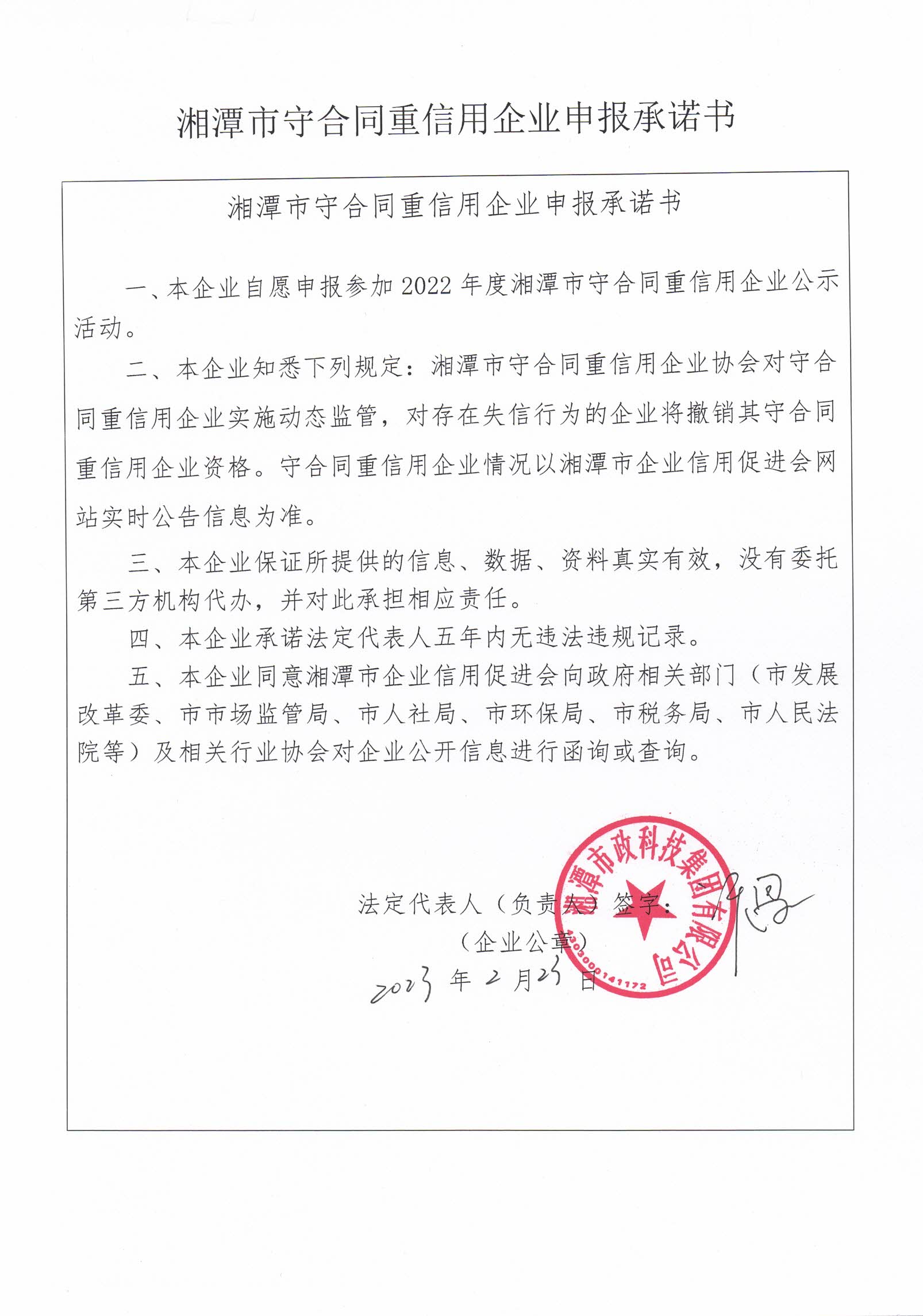 本企業(yè)根據(jù)《湘潭市守合同重信用企業(yè)申報規(guī)定》等編制 2022 年度企業(yè)信用報告書,并保證本報告書內(nèi)容真實、準(zhǔn)確、完整。