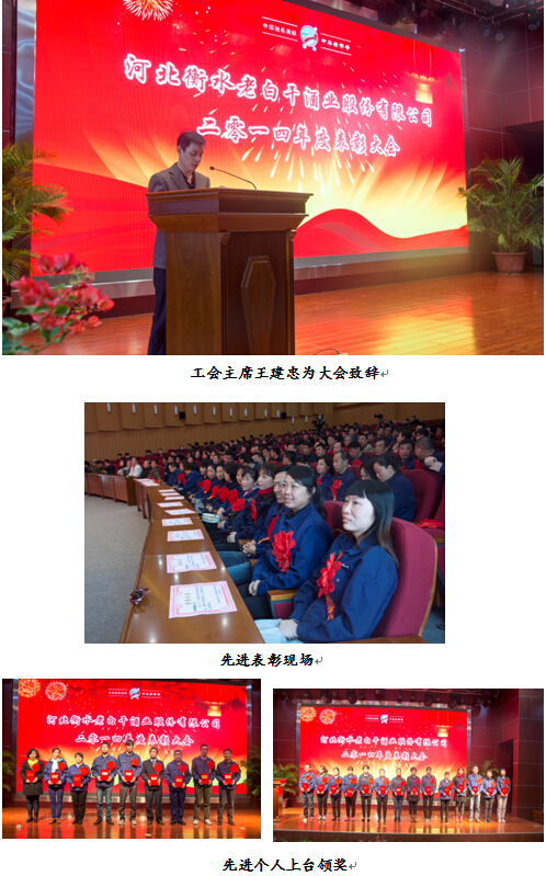 此次表彰大會,為廣大職工樹立了學(xué)習(xí)的榜樣,極大地鼓舞了職工的工作干勁。廣大職工們決心,在今后的工作中,要充分發(fā)揚(yáng)“團(tuán)結(jié)拼搏、創(chuàng)新實(shí)干、科學(xué)發(fā)展”的企業(yè)精神,團(tuán)結(jié)一致、開拓創(chuàng)新、奮力拼搏,為開創(chuàng)衡水老白干美好的明天,實(shí)現(xiàn)一流酒企的夢想而努力奮斗!