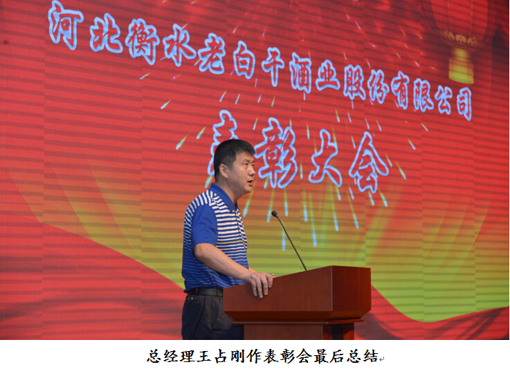 最后,酒業(yè)公司總經(jīng)理王占剛為此次表彰大會(huì)作最后總結(jié)。首先對(duì)獲獎(jiǎng)的個(gè)人和集體表示祝賀,稱(chēng)贊他們是衡水老白干企業(yè)的中流砥柱,是各部門(mén)在各自工作中涌現(xiàn)出的精英,是全體員工學(xué)習(xí)的榜樣。并且指出衡水老白干企業(yè)是進(jìn)步中的企業(yè),每位員工在工作中進(jìn)步一小步,我們衡水老白干企業(yè)將進(jìn)步一大步,鼓勵(lì)員工要在自己平凡的崗位上創(chuàng)造出不平凡的業(yè)績(jī),為我們衡水老白干的更好更快發(fā)展做出貢獻(xiàn)!