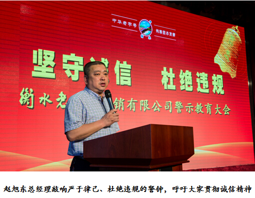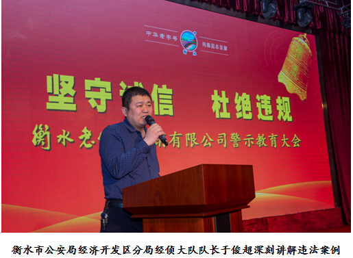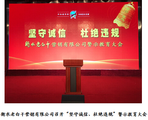 2016年5月3日,衡水老白干營(yíng)銷有限公司在酒都大廈二樓多功能廳召開“堅(jiān)守誠(chéng)信、杜絕違規(guī)”為主題的警示教育大會(huì)。在本次大會(huì)中,衡水老白干營(yíng)銷有限公司總經(jīng)理趙旭東、監(jiān)查審計(jì)中心主任石新勇分別作了重要講話。大會(huì)還特別邀請(qǐng)衡水市公安局經(jīng)濟(jì)開發(fā)區(qū)分局經(jīng)偵大隊(duì)隊(duì)長(zhǎng)于俊超作了職務(wù)侵占案件講解。