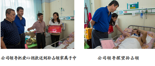 公司總經(jīng)理王占剛、副總經(jīng)理趙旭東、工會主席王建忠以及營銷公司的領導等一行,在百忙之中來到孫占領的病床前,親自把捐款送到了他家屬手中,祈盼他早日康復!