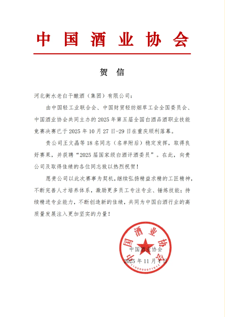近日,中國酒業(yè)協(xié)會發(fā)來賀信。在2025年第五屆全國白酒品酒職業(yè)技能競賽決賽中,衡水老白干及旗下四家子公司(河北衡水老白干酒業(yè)股份有限公司、承德乾隆醉酒業(yè)有限責(zé)任公司、湖南武陵酒有限公司、安徽文王釀酒股份有限公司)的十八名技術(shù)精英憑借深厚的專業(yè)素養(yǎng)和卓越的品評技能,從眾多參賽者中脫穎而出,成功獲得“國家級白酒評酒委員”的殊榮!