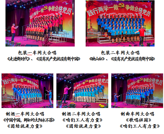 本次演唱會共有八個部門參加:制酒一車間、制酒二車間、包裝一車間、包裝二車間、制曲車間、安全中心、采購物流中心、營銷公司。各合唱團(tuán)50余人,著裝統(tǒng)一規(guī)范并各具特色,隊行整齊劃一。每個合唱團(tuán)的指揮者均為本部門職工,有的甚至是部門主管,他們手勢準(zhǔn)確、規(guī)范。合唱者更是精神飽滿、激情洋溢,演繹了《沒有共產(chǎn)黨就沒有新中國》、《團(tuán)結(jié)就是力量》、《咱們工人有力量》、《映山紅》、《一條大河》等昂揚(yáng)向上的紅色歌曲,氣勢磅礴,振奮人心!嘹亮的歌聲或激揚(yáng)或和緩,或高亢或溫婉,唱出了老白干員工內(nèi)心對黨和國家的熱愛之情,演唱極具感染力、震撼力,臺下雷鳴般的掌聲、喝彩聲經(jīng)久不息!