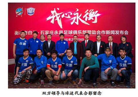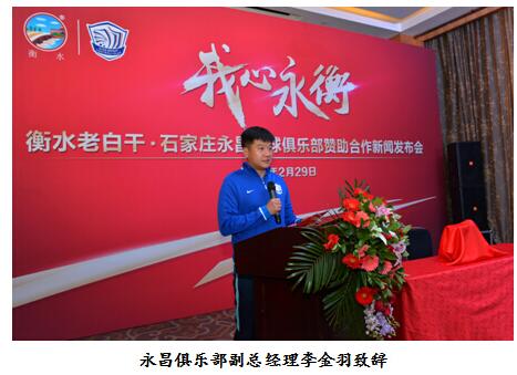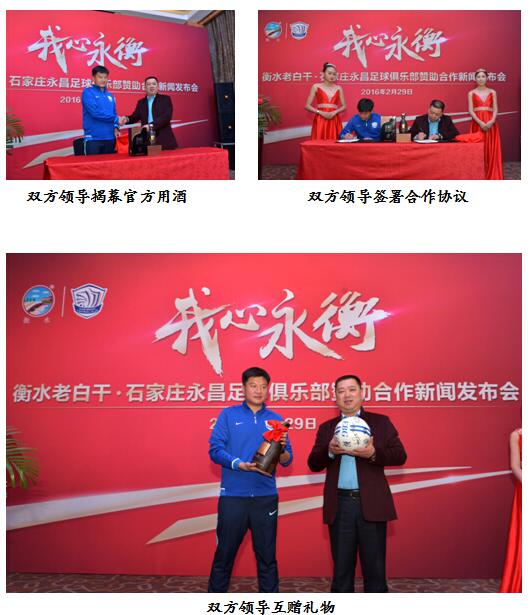 2016年2月29日,河北衡水老白干酒業(yè)股份有限公司與石家莊永昌足球俱樂部在石家莊萬達(dá)洲際酒店共同舉辦“我心永衡”——衡水老白干·石家莊永昌足球俱樂部贊助合作新聞發(fā)布會(huì)。正式宣布衡水老白干成為石家莊永昌俱樂部官方合作伙伴。參加新聞發(fā)布會(huì)的公司領(lǐng)導(dǎo)有:衡水老白干酒業(yè)股份有限公司副總經(jīng)理兼衡水老白干營銷有限公司總經(jīng)理趙旭東、衡水老白干營銷有限公司副總經(jīng)理張毅超、衡水老白干營銷有限公司市場(chǎng)部副經(jīng)理孫泉朝;永昌足球俱樂部出席的嘉賓有:石家莊永昌俱樂部常務(wù)副總經(jīng)理兼技術(shù)總監(jiān)李金羽、石家莊永昌足球俱樂部副總經(jīng)理任洪江、球員代表關(guān)震及球迷代表。