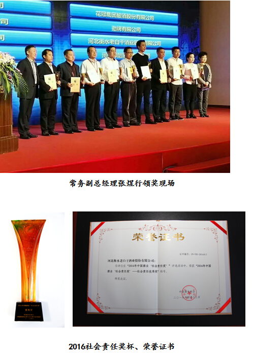 衡水老白干酒業(yè)公司憑借業(yè)績突出,合法納稅、關(guān)注員工福利,保護(hù)員工權(quán)益、保證產(chǎn)品質(zhì)量,維護(hù)消費(fèi)者權(quán)益、關(guān)注社會(huì)公益,持續(xù)回報(bào)社會(huì)等多方面對(duì)社會(huì)的突出貢獻(xiàn),榮獲2016中國酒業(yè)“社會(huì)責(zé)任獎(jiǎng)”優(yōu)秀獎(jiǎng)。