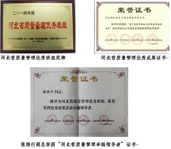 近日,由河北省質(zhì)量與名牌學會等五部門聯(lián)合組織開展的2014年質(zhì)量管理“雙百優(yōu)”活動評比結果揭曉,我公司制酒一車間4-10組、6-7組、制酒二車間9-1組、包裝一車間23組、11組、包裝二車間31組、42組、47組及路北區(qū)評酒室9個班組獲得“河北省質(zhì)量管理優(yōu)秀班組”榮譽稱號;研究所“基于專家勾調(diào)的大容量基酒組合技術” 獲得“河北省質(zhì)量管理優(yōu)秀成果”榮譽稱號,酒業(yè)公司常務副總經(jīng)理張煜行獲“河北省質(zhì)量管理卓越領導者”榮譽稱號。